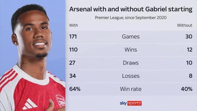 在俱樂部層面,加布里埃爾與薩利巴組成的阿森納防線是世界一流的中衛(wèi)搭檔。本賽季,加布里埃爾在英超、歐冠等重要比賽中全部保持全勤。據(jù)天空體育統(tǒng)計,阿森納在沒有加布里埃爾的情況下,勝率下跌多達(dá)24%。自2020年9月以來,加布為阿森納出戰(zhàn)的171場比賽中,阿森納取勝110場,勝率64%;而加布缺陣的30場比賽中,阿森納12勝10平8負(fù),勝率跌到40%,差距明顯。
